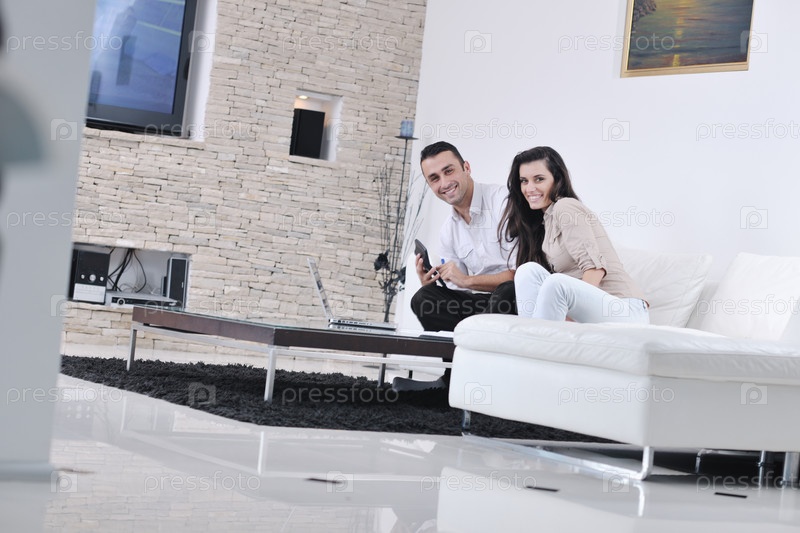 Молодая пара с ноутбуком и калькулятором в современной гостиной