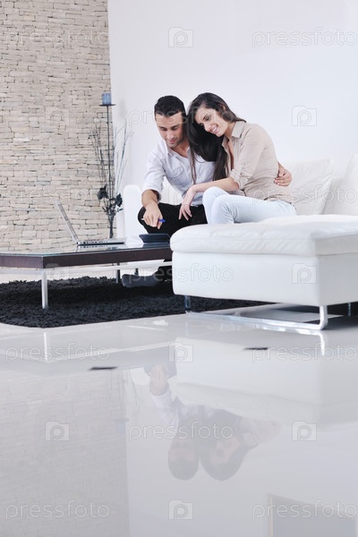 Молодая пара с ноутбуком и калькулятором в современной гостиной