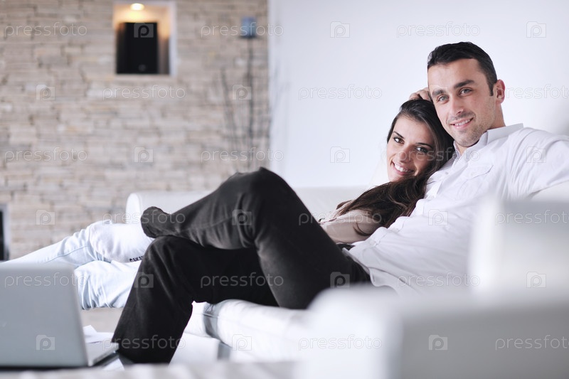 Молодая пара с ноутбуком в современной гостиной