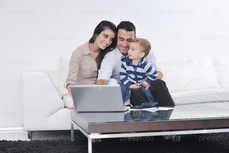 Счастливая молодая семья в новой квартире