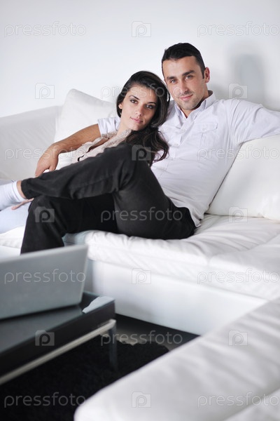 Молодая пара с ноутбуком в современной гостиной
