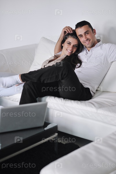Молодая пара с ноутбуком в современной гостиной