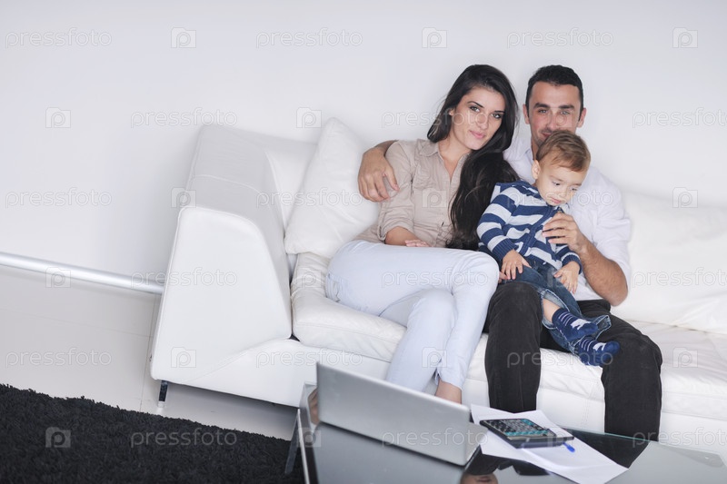 Счастливая молодая семья в новой квартире