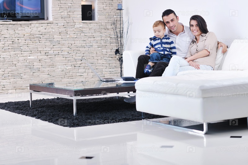 Счастливая молодая семья в гостиной