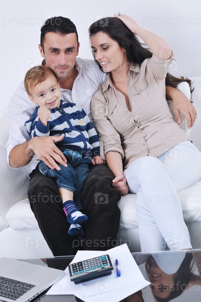 Счастливая молодая семья в гостиной