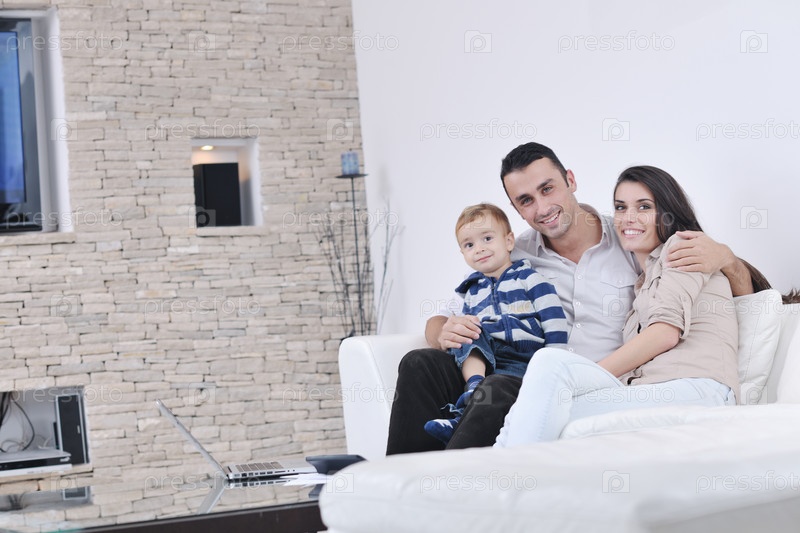 Счастливая молодая семья в гостиной
