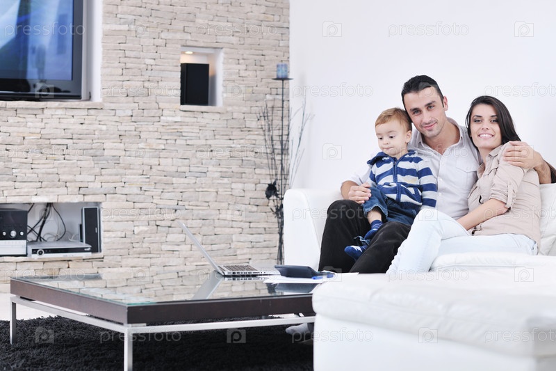 Счастливая молодая семья в гостиной