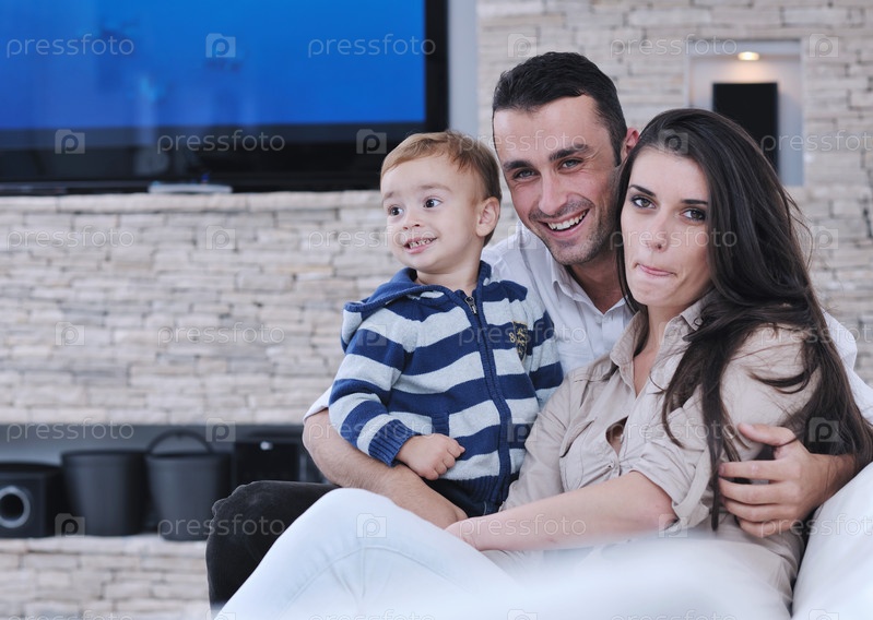 Счастливая молодая семья отдыхает в новой квартире на фоне современного телевизора