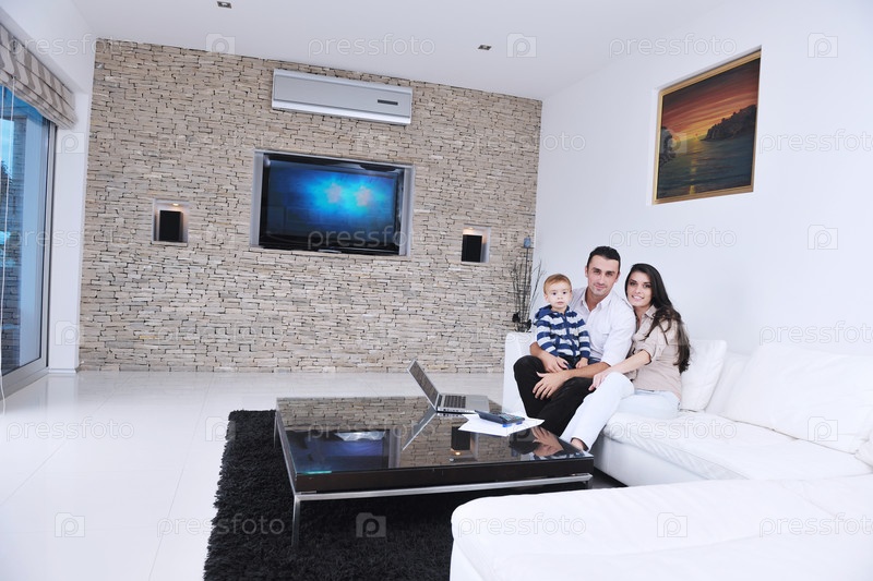 Счастливая молодая семья отдыхает в новой квартире с современным телевизором