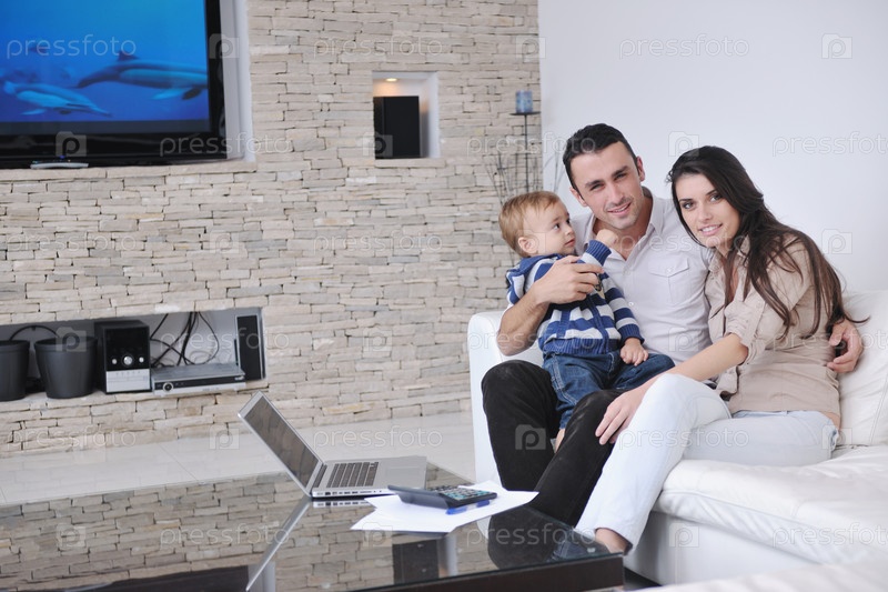 Счастливая молодая семья отдыхает в новой квартире с современным телевизором