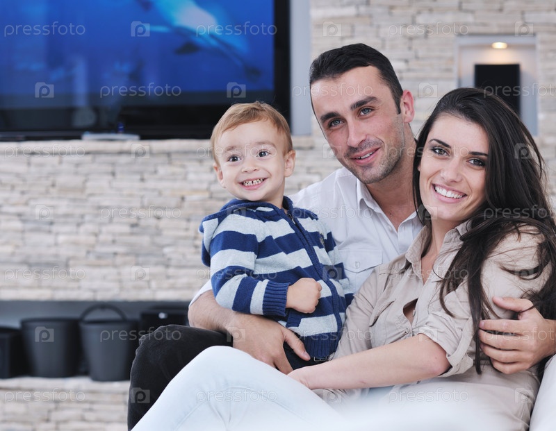 Счастливая молодая семья отдыхает в новой квартире с современным телевизором