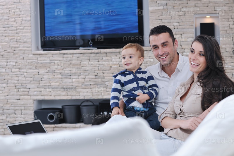 Счастливая молодая семья отдыхает в новой квартире с современным телевизором