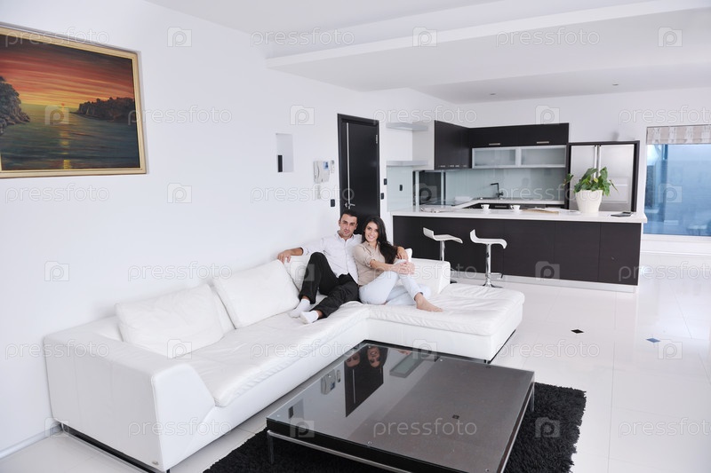 Молодая пара на диване в современной гостиной