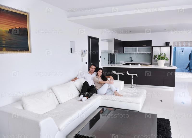 Молодая пара на диване в современной гостиной