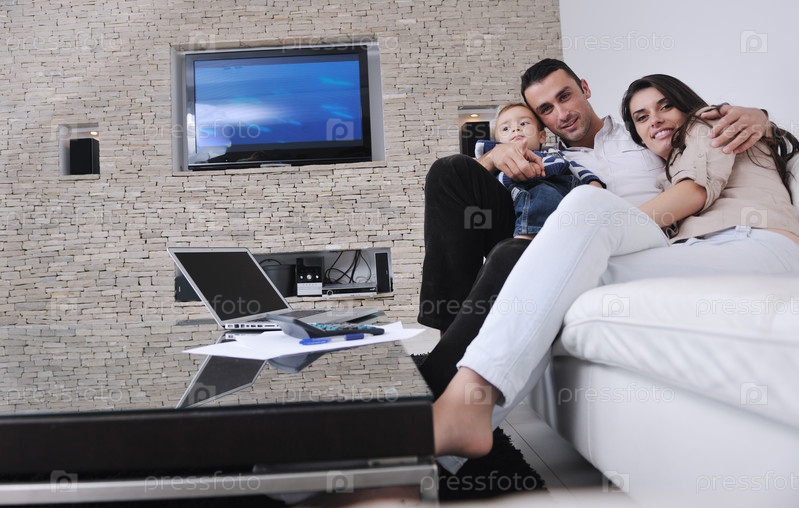 Счастливая молодая семья в гостиной