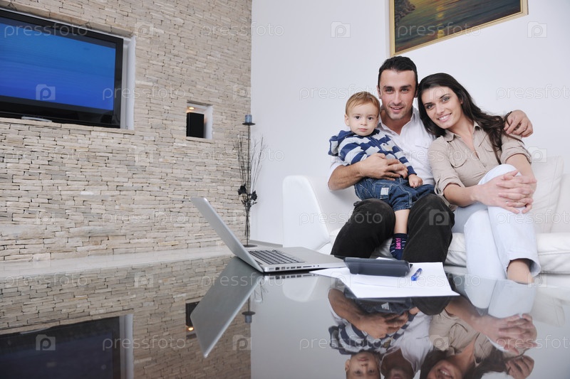Счастливая молодая семья в гостиной