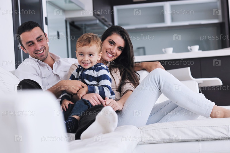 Счастливая молодая семьи дома в современной гостиной