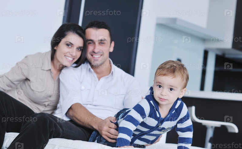 Счастливая молодая семьи дома в современной гостиной