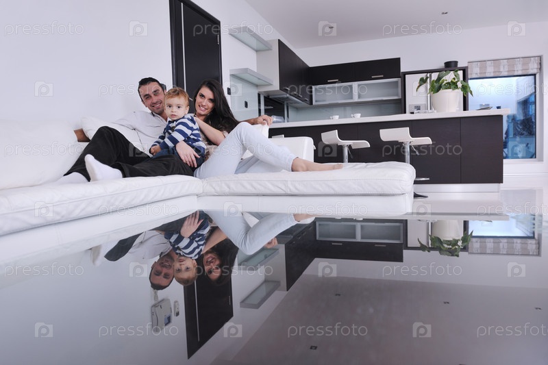 Счастливая молодая семьи дома в современной гостиной