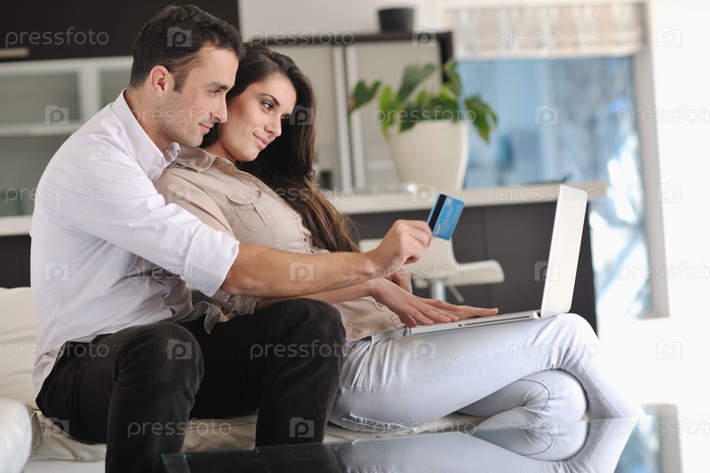 Счастливая пара с ноутбуком и кредитной картой в современной гостиной