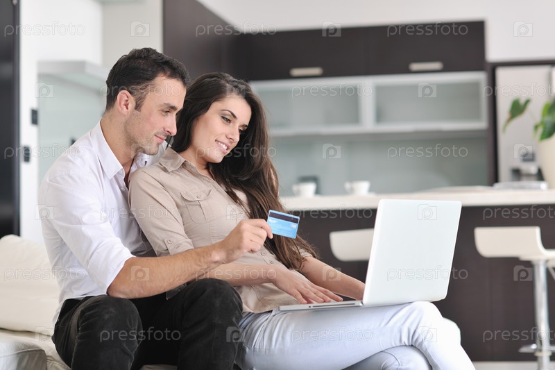 Счастливая пара с ноутбуком и кредитной картой в современной гостиной