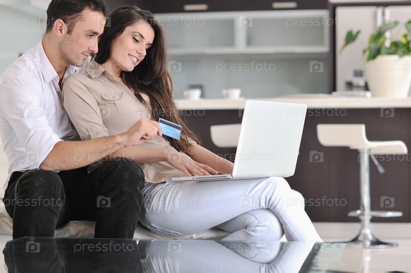 Счастливая пара с ноутбуком и кредитной картой в современной гостиной