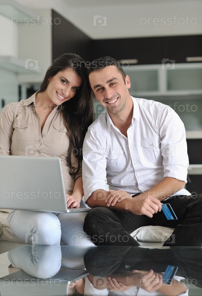 Счастливая пара с ноутбуком и кредитной картой в современной гостиной