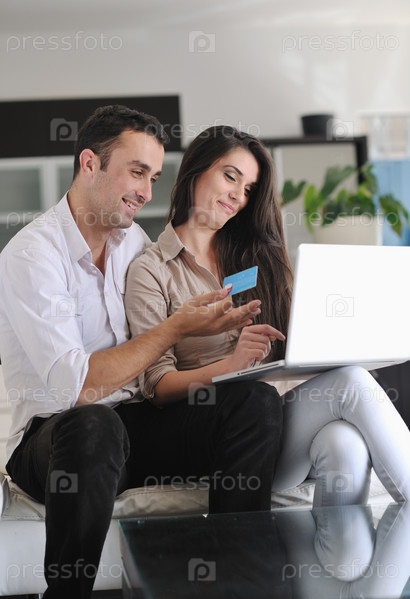 Счастливая пара с ноутбуком и кредитной картой в современной гостиной