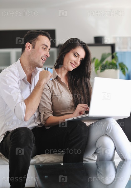 Счастливая пара с ноутбуком и кредитной картой в современной гостиной