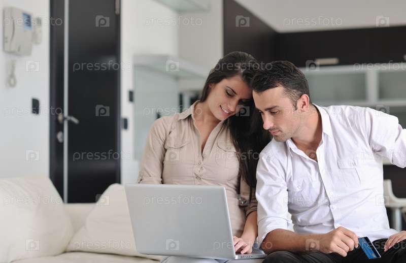 Молодая счастливая пара с ноутбуком и банковской карточкой в современной домашней гостиной