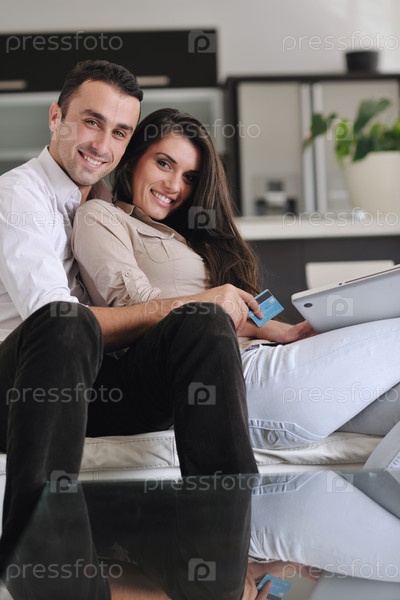 Счастливая пара с ноутбуком и кредитной картой в современной гостиной