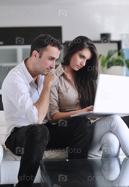 Счастливая пара с ноутбуком и кредитной картой в современной гостиной