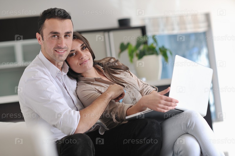 Счастливая пара с ноутбуком и кредитной картой в современной гостиной