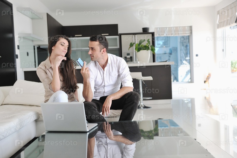 Молодая счастливая пара с ноутбуком и банковской карточкой в современной домашней гостиной