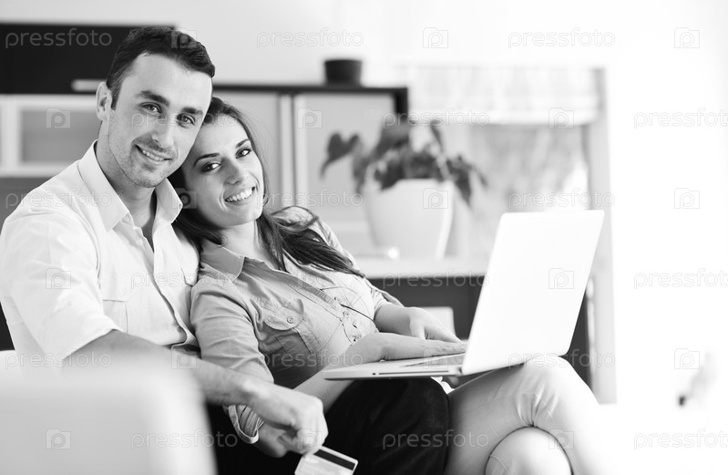 Счастливая пара с ноутбуком и кредитной картой в современной гостиной