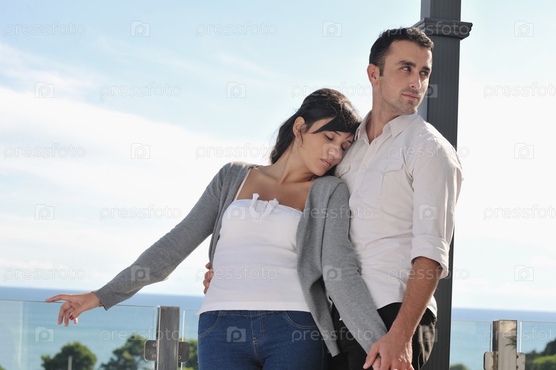 Счастливая молодая пара на балконе с видом на океан