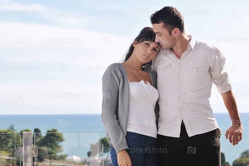 Счастливая молодая пара на балконе с видом на океан