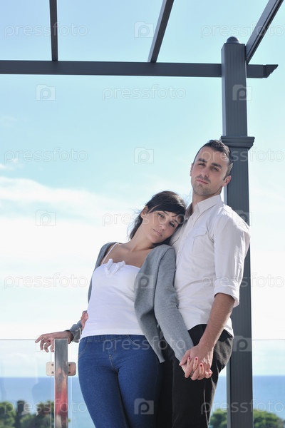 Счастливая молодая пара на балконе с видом на океан