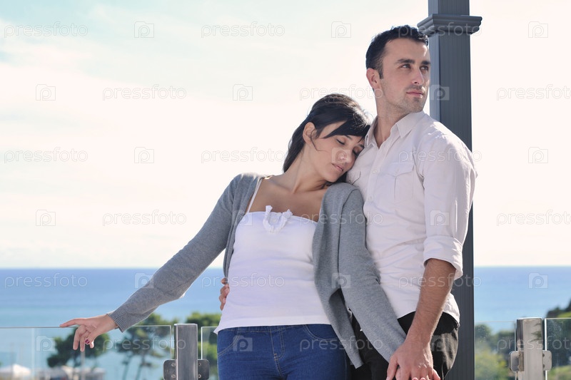 Счастливая молодая пара на балконе с видом на океан