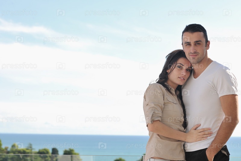 Счастливая молодая пара на балконе с видом на океан