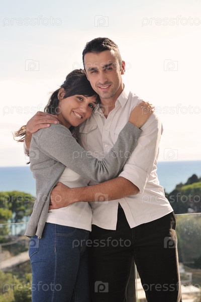 Счастливая молодая пара на балконе с видом на океан