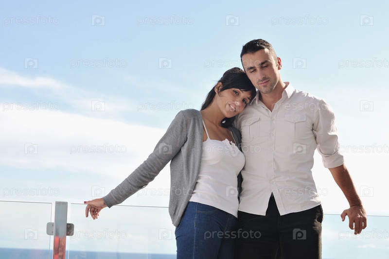 Счастливая молодая пара на балконе с видом на океан