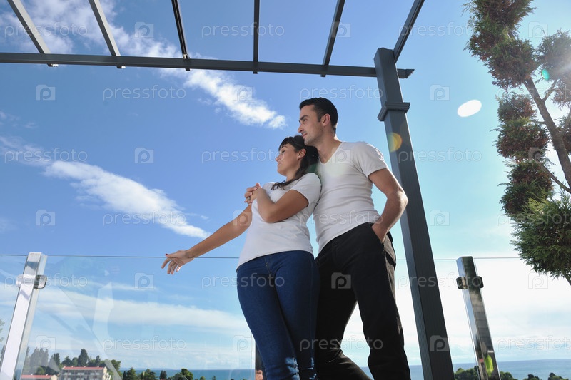 Счастливая молодая пара на балконе с видом на океан