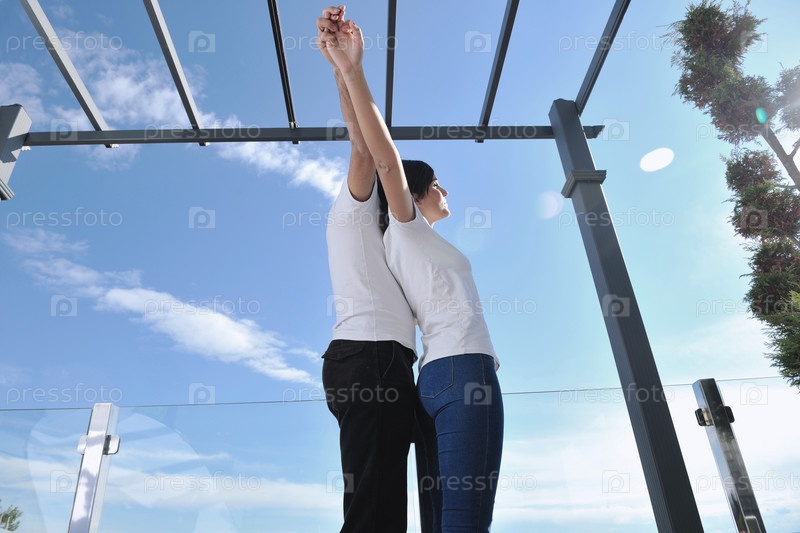Счастливая молодая пара на балконе на фоне неба