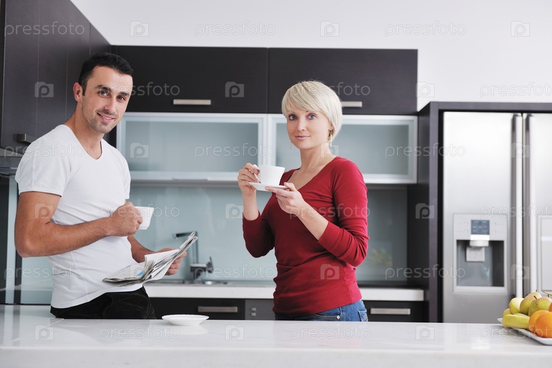 Счастливая молодая пара на современной кухне