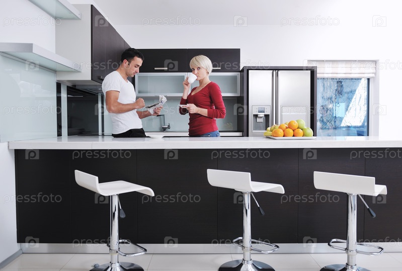 Счастливая молодая пара на современной кухне