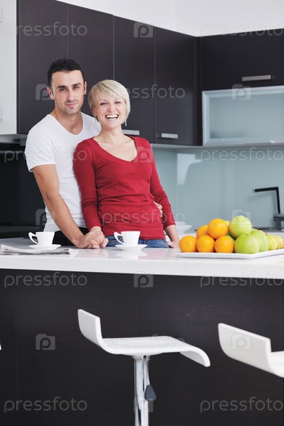 Счастливая молодая пара на современной кухне