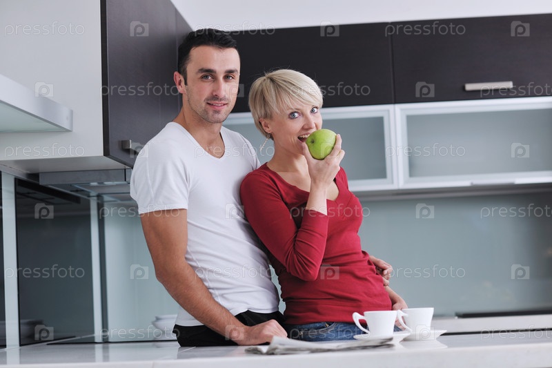 Счастливая молодая пара на современной кухне