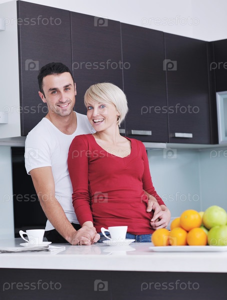 Счастливая молодая пара на современной кухне
