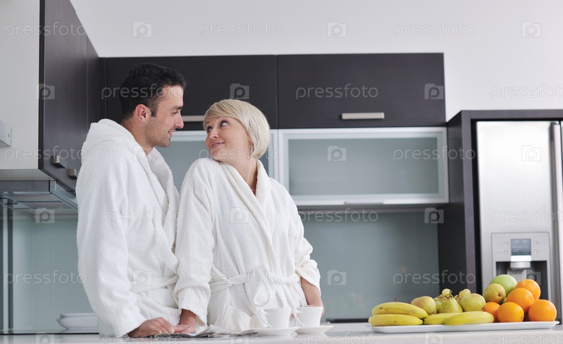 Счастливая молодая пара на современной кухне